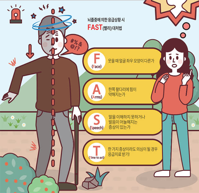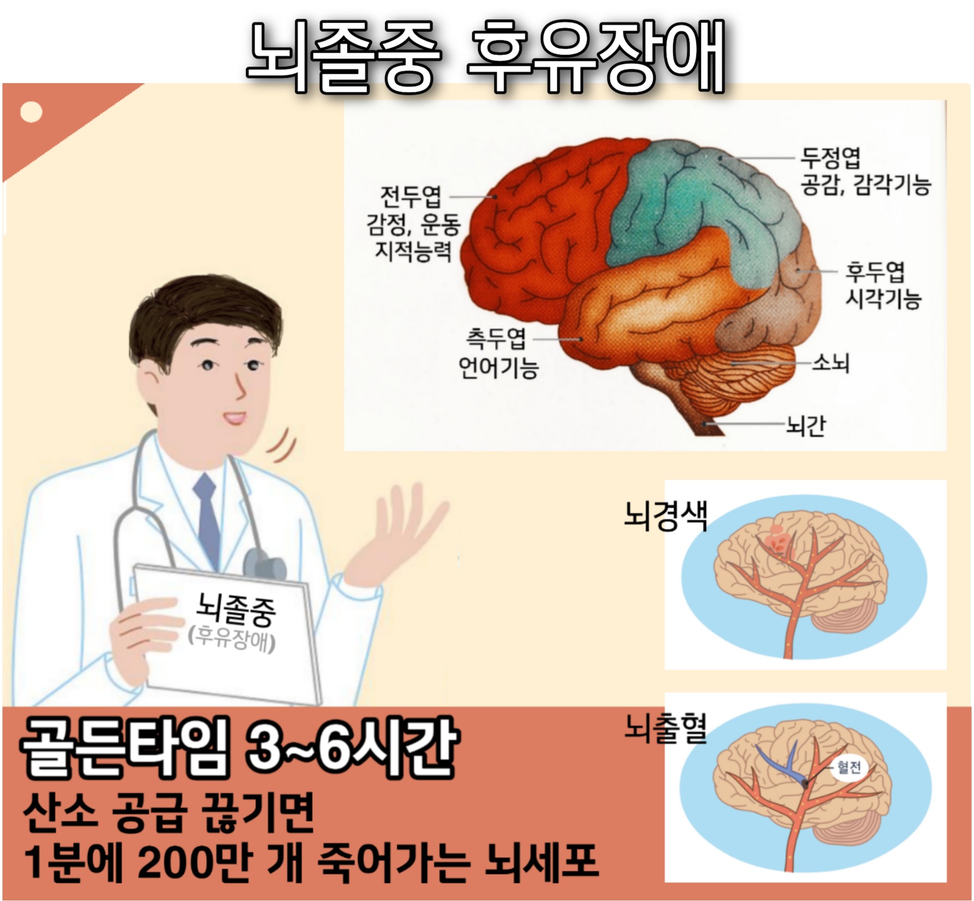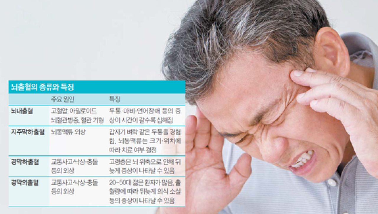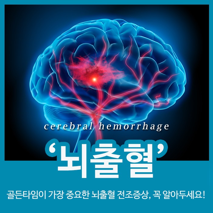 뇌출혈의 무서운 점은 뇌경색과는 다르게 전조증상이 없다는 점입니다. 특별한 증상 없이 갑자기 발생하는데, 일반적으로 망치로 내려찍는 것 같은 극심한 두통으로 시작이 되는 경우가 많고, 두통이 심하지 않더라도 한쪽의 팔다리 마비와 의식이 흐려지는 증상이 동반되면 뇌출혈을 의심해야 합니다. 뇌출혈이 생기면 두통, 현기증, 마비 등의 증상에 이어 발작, 구토가 일어납니다. 뇌출혈이 발생한 순간부터는 빠르게 뇌손상이 진행이 되고 그 이후에는 뇌부종과 재출혈로 악화될 수 있기 때문에 이러한 증상이 있으면 최대한 빨리 병원으로 가야 합니다. 뇌경색은 막힌 혈관을 개통 시킬 수 있는 골든타임이 있으나, 뇌출혈은 골든타임이 없습니다.