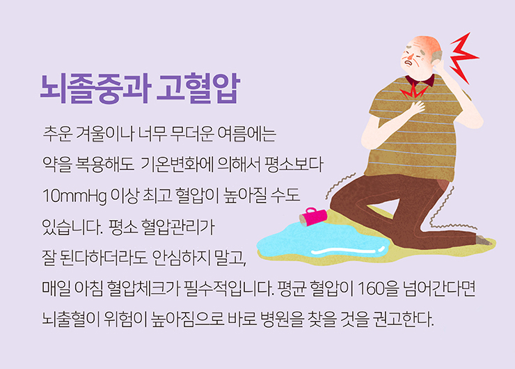 고혈압은 뇌출혈의 약 75%을 차지하며 뇌혈관의 약한 부분이 터짐으로써 발생합니다. 뇌출혈은 뇌동맥류나 동정맥기형(출혈성질환)과 같은 뇌혈관질환이 없더라도 고혈압으로 인해 뇌 안의 모세혈관들이 터지면서 발생하는 질환입니다. 한순간에 반신마비가 되거나 의식불명, 사망까지 이르게 할 정도의 무서운 질환이라서 주로 발생하는 부위(호발부위)가 있지만 전반적으로 발생할 수 있습니다. 뇌 조직에 산소와 영양분을 공급해 주는 혈관이 장기간 고혈압에 노출되면 변화가 생깁니다. 이럴 때 과도한 흥분이나 정신적 긴장, 과로 등의 요인에 의해 혈압이 상승하면 혈관이 견디지 못하고 터질 수 있습니다. 특히 당뇨가 있거나 고지혈증이 있는 환자들에게는 더 흔히 발생할 수 있습니다.