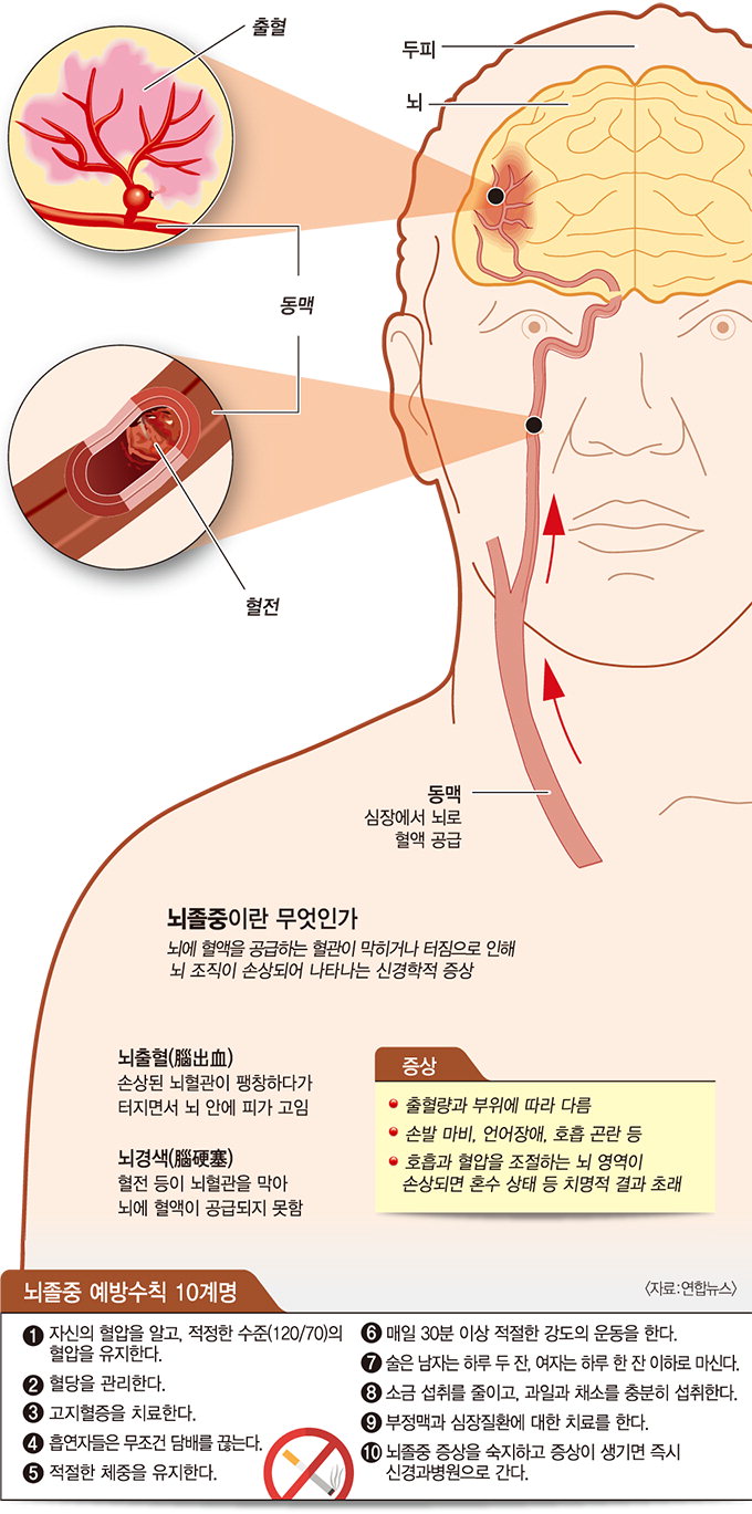 뇌출혈이란 뇌혈관 벽의 약한 부분이 터져 출혈이 생김으로써 발생하는 뇌혈관 장애를 의미합니다. 두개골 내의 출혈에 한해서 뇌일혈이라고도 합니다. 뇌출혈은 발생하는 순간부터 압력과 출혈 자체로 뇌가 손상되는 무서운 질환으로 우리나라에서는 1년에 약24,000명 정도 발생하고 있다고 합니다.